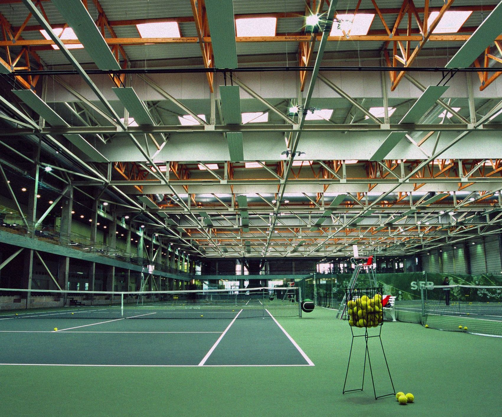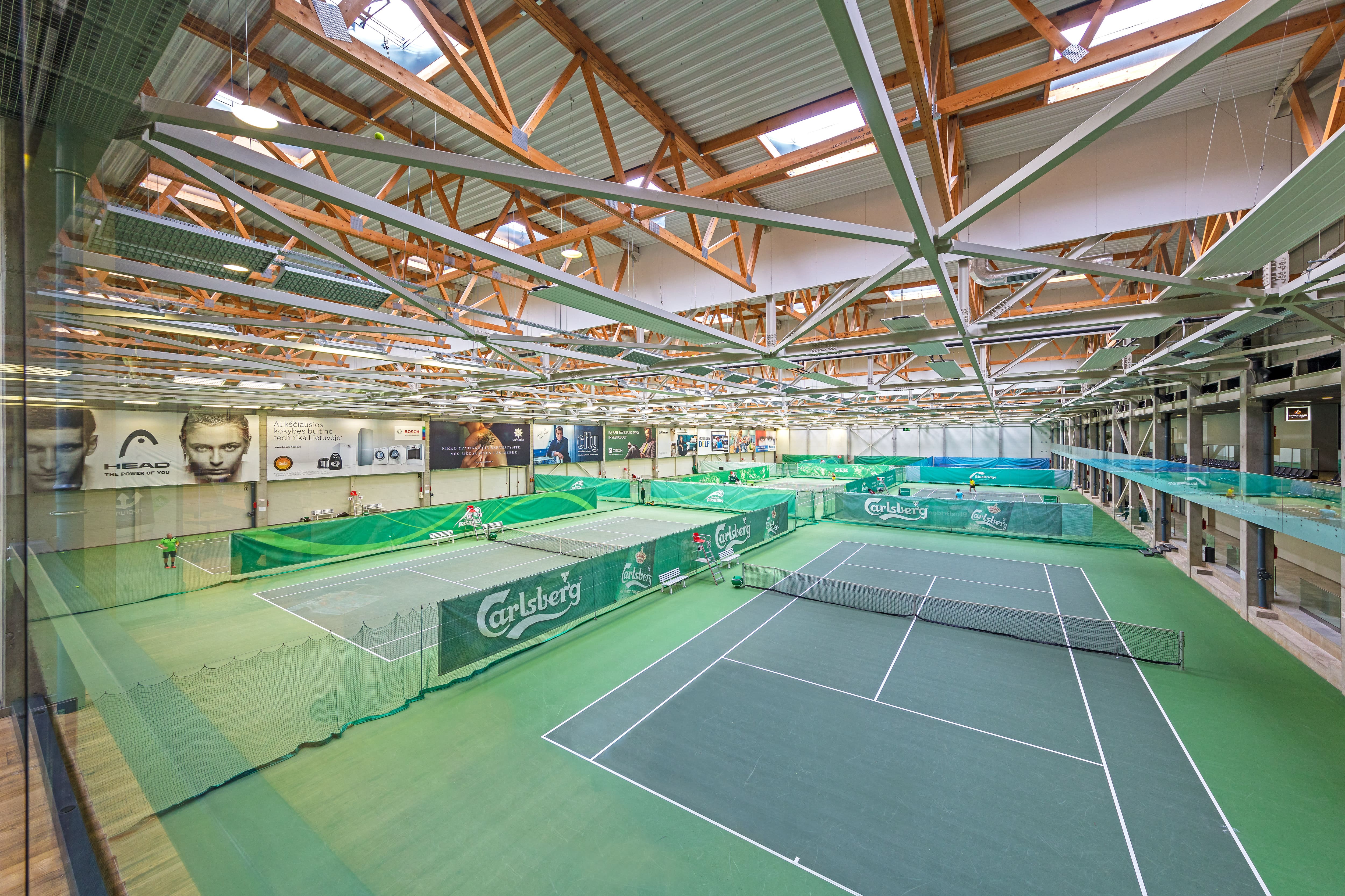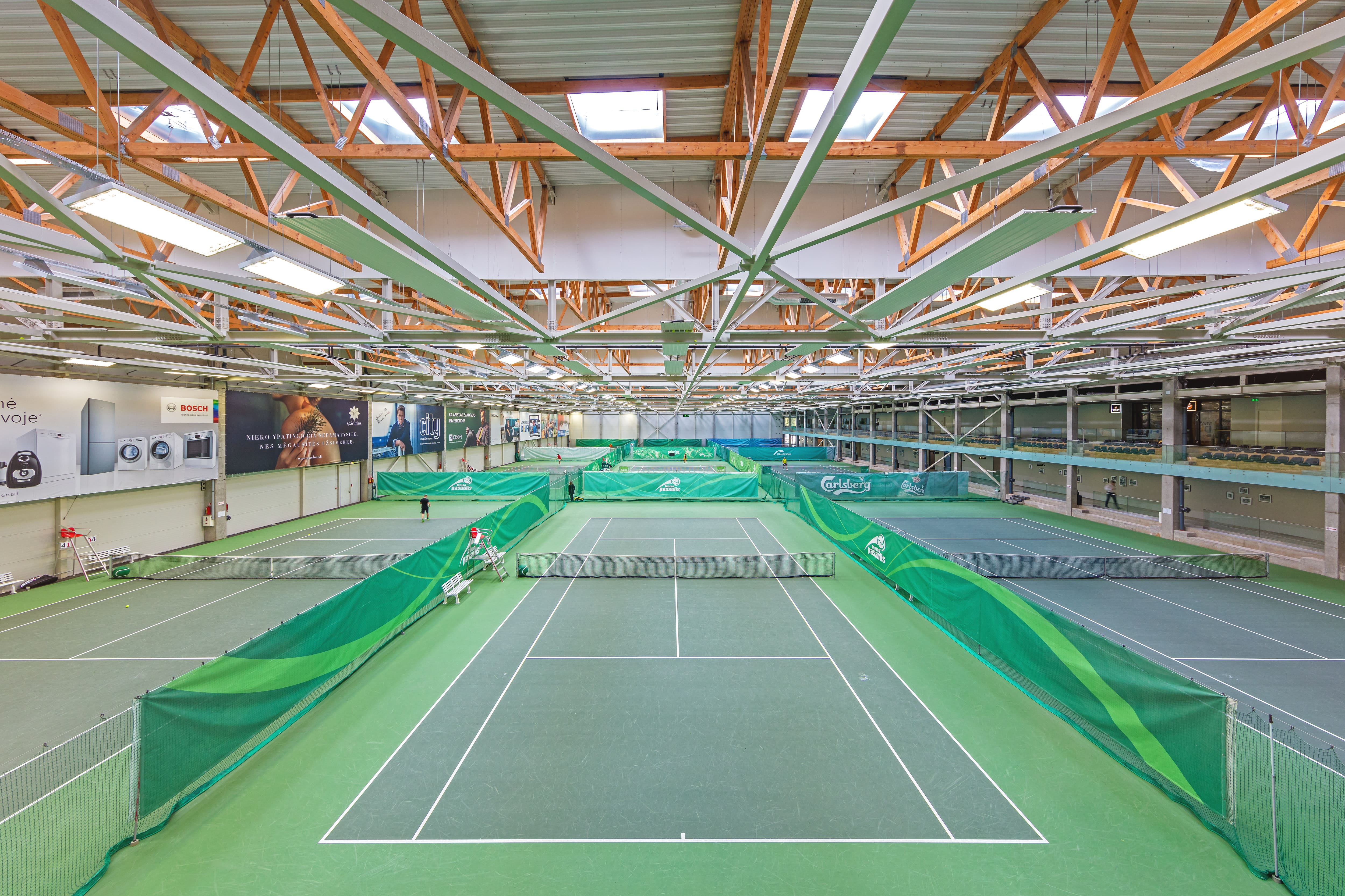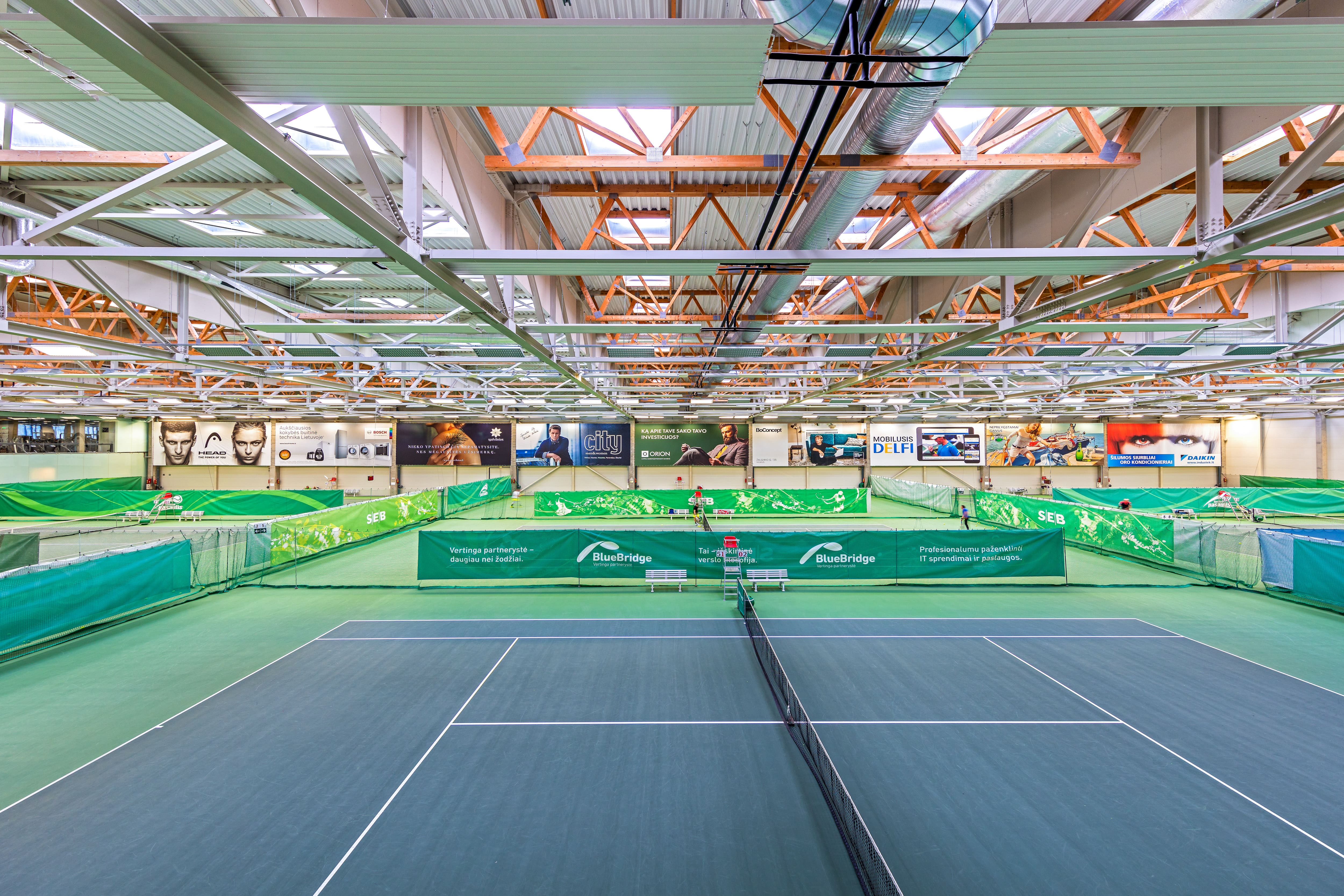 Spindulinio šildymo plokštės įrengtos ypač erdviose teniso arenos patalpose. Didelio aukščio erdvėms parinktas idealiai tinkantis ekonomiškas šildymo būdas. Vasarą ta pati sistema - patalpas vėsina.
